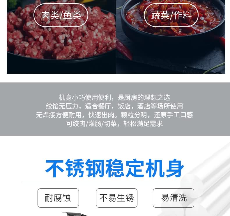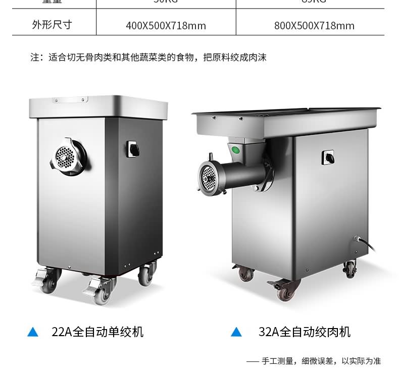 艾博馳ABCH-L32A絞肉機(jī)(高強(qiáng)度承重輪),內(nèi)置RV減速箱,速度大,回差小,振動低,承受能力強(qiáng),更可靠。入料口防護(hù)擋板,3毫米不銹鋼機(jī)身,2.2大功率國標(biāo)全銅芯電機(jī),防水開關(guān),不銹鋼網(wǎng)板刀組,不銹鋼帶剎車萬向輪.贈送原裝十字刀,孔板,搗肉棒,灌腸喇叭口一套.標(biāo)配絞肉網(wǎng)板6和8毫米。