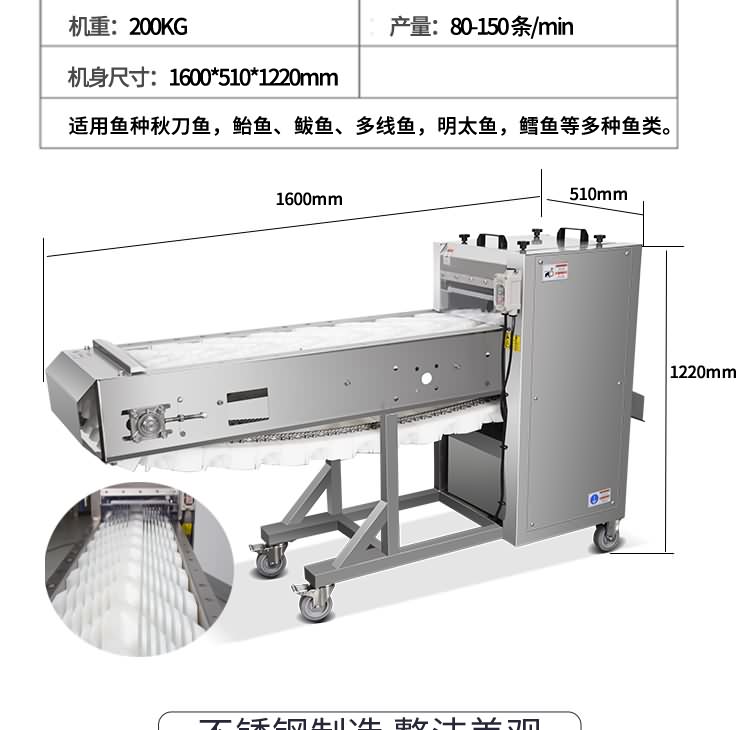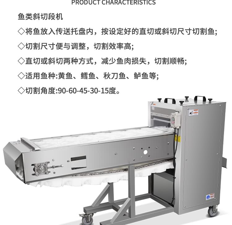 艾博馳ABCH-SQ69切魚段機(雙通道)將魚放入傳送托盤內(nèi),按設(shè)定號的直切或斜切切割魚段,切割尺寸便于調(diào)整,切割效率高,切割分為直切或者斜切兩種方式,減少魚肉損失,切割角度90°、60°、45°、30°、15°,適用于黃魚、鱈魚、秋刀魚、鱸魚等。