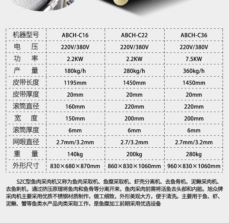 艾博馳ABCH-C36魚肉采肉機是一款加工魚肉去刺、蟹蝦去殼的機械,由于隨著市場的發(fā)展,人們生活中漸漸離不開有魚的生活,無論是家里、飯店等魚都是主要的食物還有現(xiàn)在一些休閑食品中都是離不開魚加工后的魚泥。魚肉采肉機的研制成功給人們生活中帶來很多方便,無論是您做魚丸、魚餡等都將需要一款魚肉采肉機,對于大量生產(chǎn)即降低了人工成本,又提高了生產(chǎn)效率。